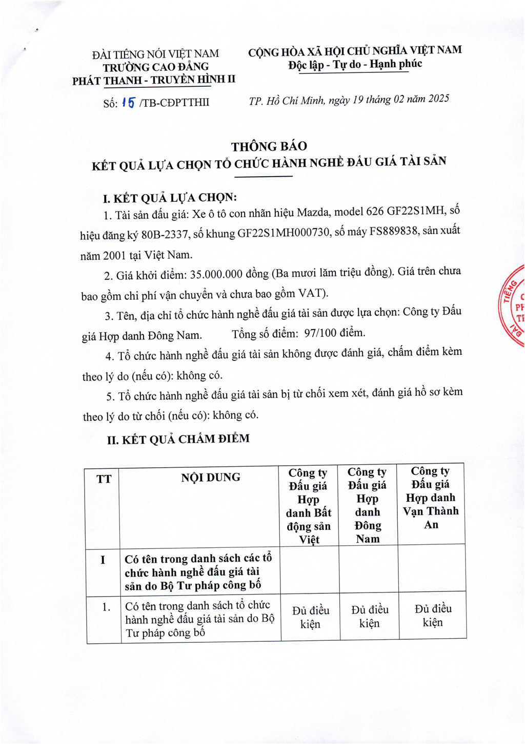 Thông báo về việc lựa chọn tổ chức bán đấu giá tài sản