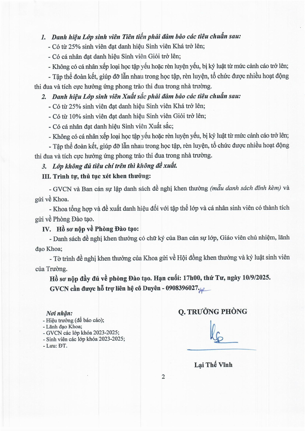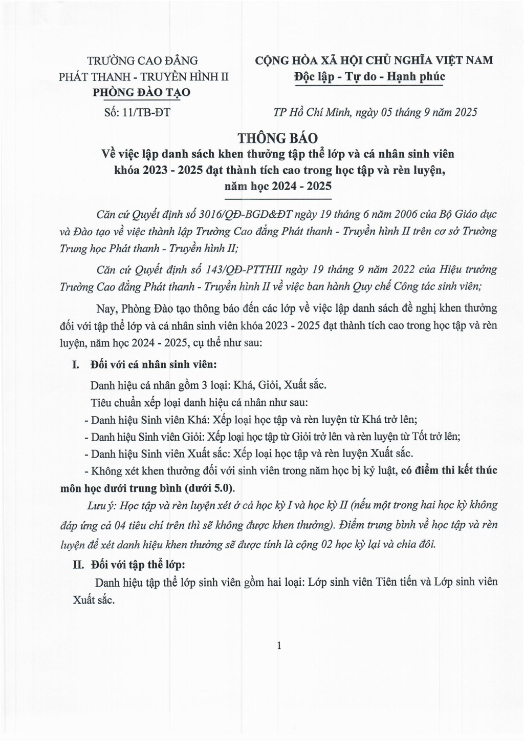 Trang chủ / Thông báo về việc lập danh sách khen thưởng tập thể lớp và cá nhân sinh viên khóa 2023 - 2025 đạt thành tích cao trong học tập và rèn luyện, năm học 2024 - 2025
