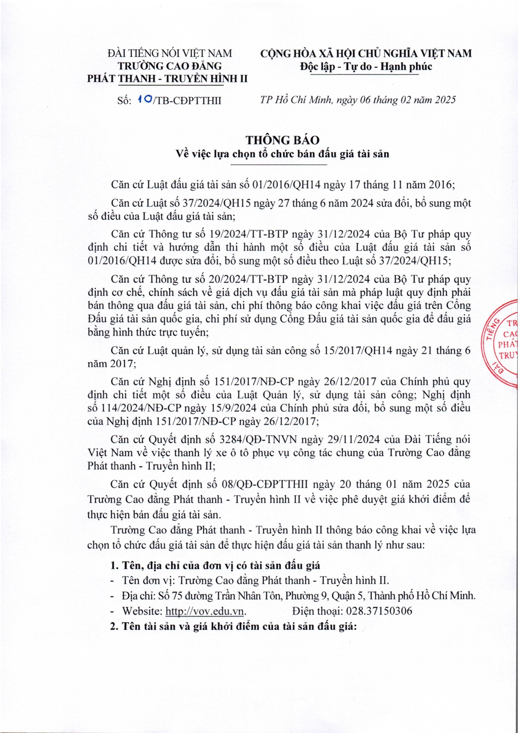 Thông báo về việc lựa chọn tổ chức bán đấu giá tài sản